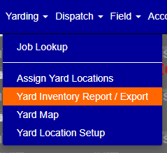 You access the Yard Inventory Report/Export screen from the Yarding menu, shown below.
