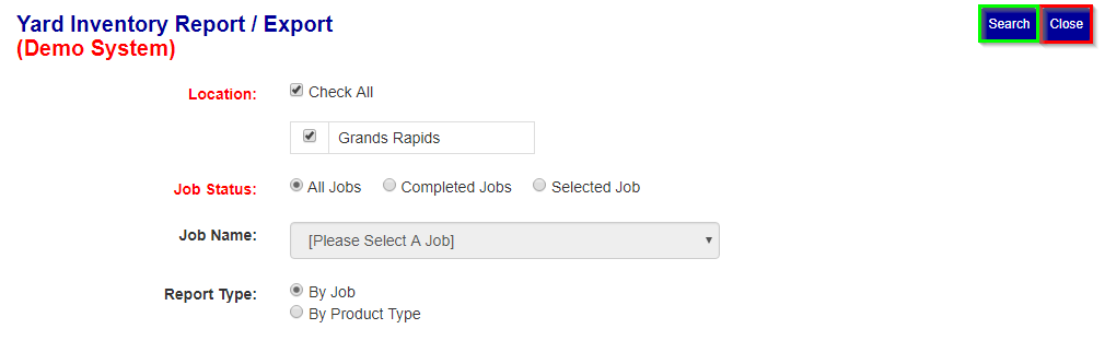 After selecting the information click the "search" button (see Green box in Figure 2) to go to the view screen where you can then view, export, or open the report for the yard inventory.