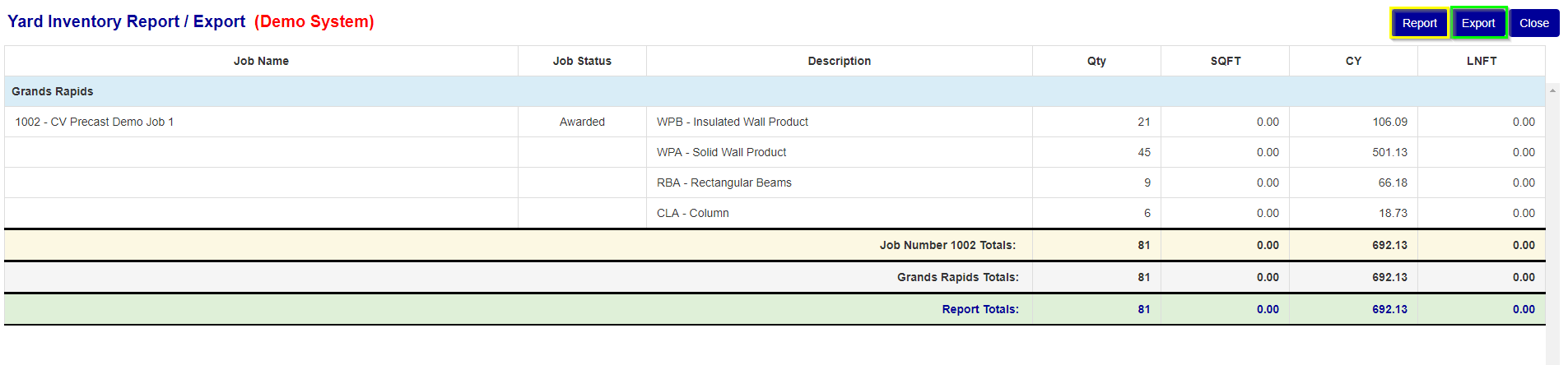 The Yard Inventory Report/Export screen (see Figure 3) is where you can export and view Yard Inventory.