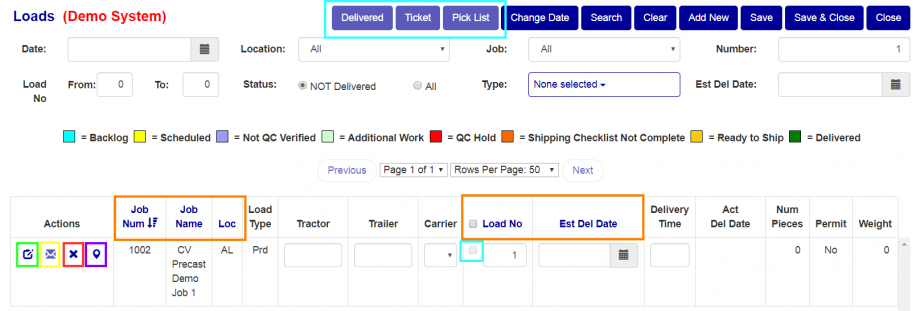 In order to use any of these buttons (Teal box in Figure 2), you must mark any applicable loads using the corresponding check box in the loads column (Teal box in Figure 2). Only loads with pieces on them can be used selected for these actions.