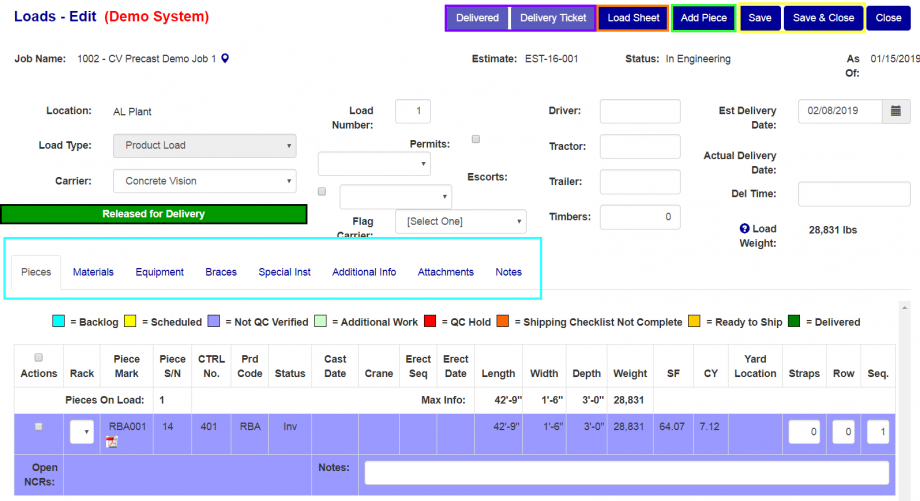 To view or print the load sheet PDF containing the load pieces, click on the "Load Sheet" button (Orange box in Figure 5).