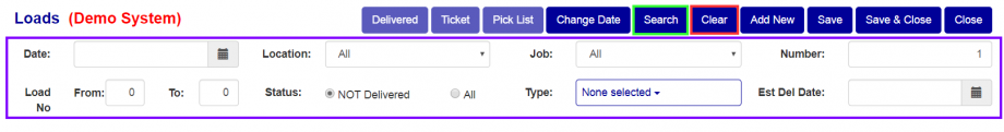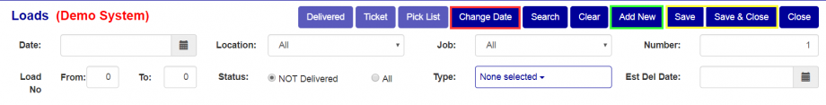 To add a new load you first have to choose a location and job in the filter (For how to use the filter see above). Once those have been added, when you press the "Add New" button (Green box in Figure 4), a new load, 1 number higher than the previously highest number, will be created.