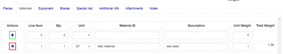 From the material tab you can add and delete material pertaining to the load. To add an item, fill out the top row of the table. Once appropriate information has been added and/or changed, click the "+" button (Green box in Figure 7) to add the new material. To edit any materials, simply adjust the fields and press the save or save and close button depending on if you wish to go back to the loads screen. If you wish to delete the material, press the "X" button (Red box in Figure 7) on the corresponding row of the material you wish to delete and confirm the deletion.