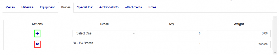 From the braces tab you can add and delete braces for the load. To add an item, fill out the top row of the table, the weight will be automatically filled out by selecting the appropriate item in the braces selector, but can be adjusted manually afterwards. Once appropriate information has been added and/or changed, click the "+" button (Green box in Figure 9) to add the new braces. To edit any braces, simply adjust the fields and press the save or save and close button depending on if you wish to go back to the loads screen. If you wish to delete a brace, press the "X" button (Red box in Figure 9) on the corresponding row of the brace you wish to delete and confirm the deletion.