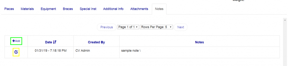 From the notes tab you can add and edit notes for the load. To add a note, click the "+Add" button (Green box in Figure 13) and enter the text in the modal window that opens, then confirm the entry on the modal. To edit a note, click the edit button (Yellow box in Figure 13) on the corresponding row of the note you want to edit. You can also sort the notes by heading like the screens above.