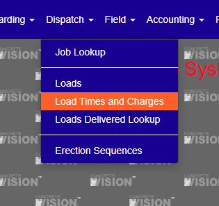 You access Concrete Log from the Dispatch > Load Times and Charges, shown below.
