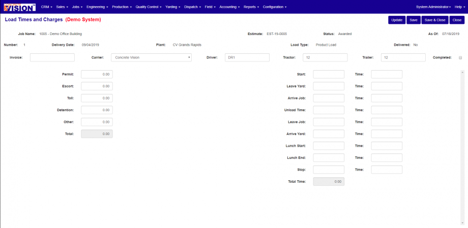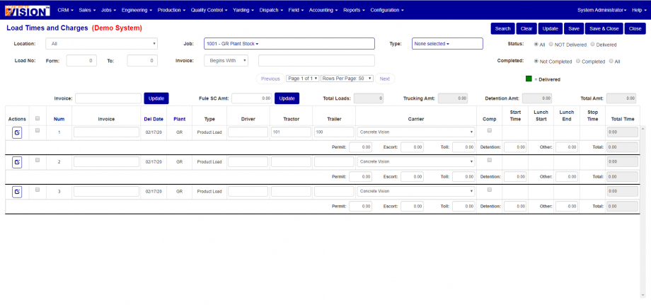 The Load Times and Charges search screen (see Figure 2) is where you can search for loads for a given job, type, status, load no, invoice number and if the load has been completed.