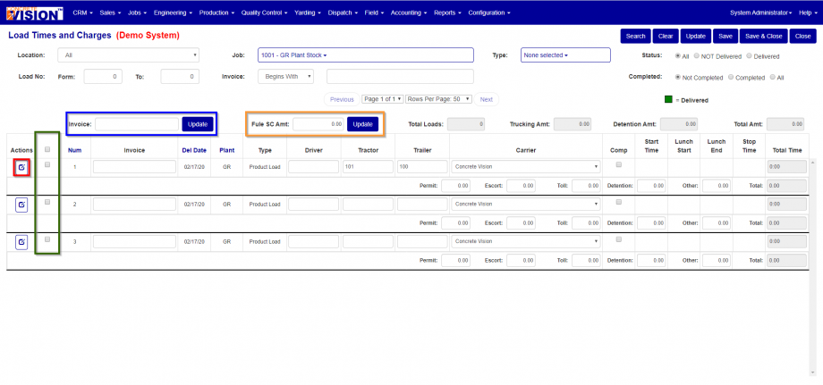 - To update the invoice number for multiple loads at once fill in the invoice number in the Invoice text box (see Figure 3 Blue Box)