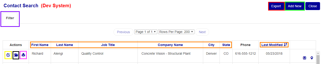 Once on the Contact search screen click the "Edit" button for the corresponding Contact you wish to edit (Yellow box in Figure 2).