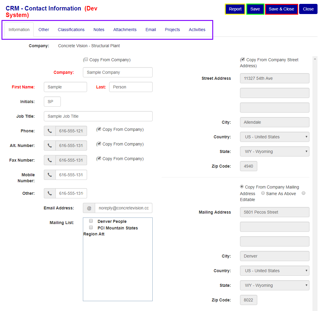 Using the tabs at the top of the screen (Purple box in Figure 4) you can also edit other Contact information such as classifications for the Contact or Contact notes for instance. To navigate to a different tab, just click on the title of the tab you wish to visit, then to edit any of the information and press "Save " (Green box in Figure 4) to be brought to the same screen after saving, or "Save and Close" (Red box in Figure 4) to save the information then return to the main Contact list screen. Some of the screens such as the Contact information tab will have extra functions such as "Report" (Yellow box in Figure 4) that will allow you to do functions such as convert the screen to a report on a new tab as is the case for the report button, and some screens will have sub-menu's but as far as the Contact information goes the principal of entering or selecting the appropriate information then saving applies.
