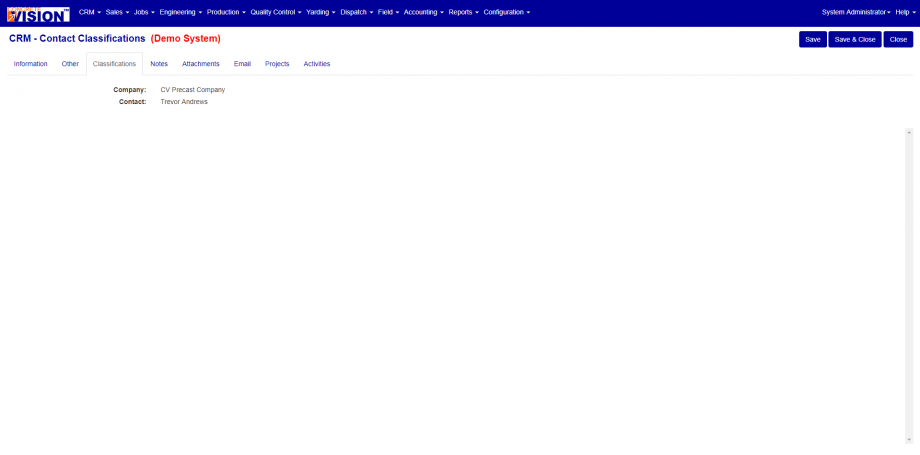 The Classification tab is where you can select which classification(s) the company belongs too. These classifications are used to create project resource drop-down list of values. You can maintain the Contact Classifications list on the Configuration menu.