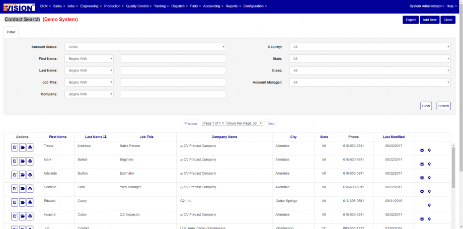 The Contact List screen can be sorted by clicking on any column heading. You can also add or edit contacts from this screen. There also is an Export feature to send the list of companies to Microsoft® Excel®.