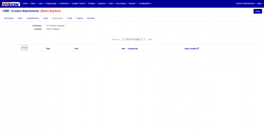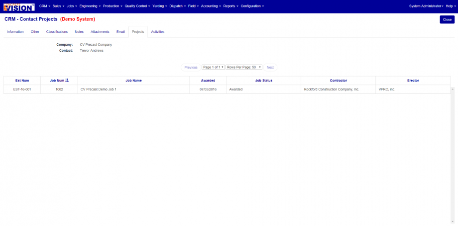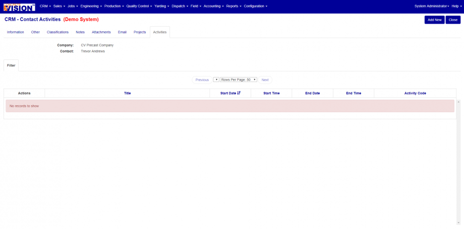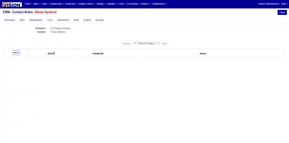 The Notes tab displays all the notes entered for the specified contacts. You can also create a new activity from this screen. Once a note is added into the system, it is stamped with the date, time and employee that entered the note. All notes entered into Concrete Vision cannot be edited once they are saved. This allows for a complete and accurate history of information.