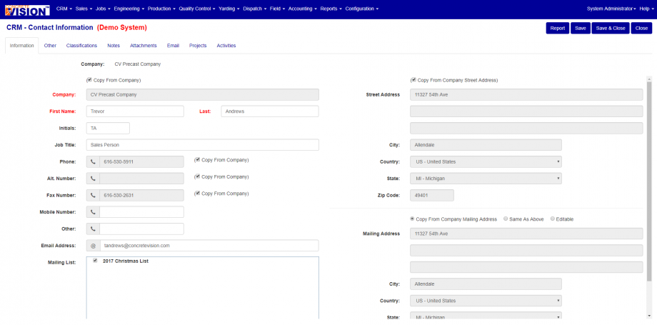 The Contact tab is where you find the phone and fax numbers. From this tab you can also enter the street and mailing address. By using the tabs across the top of the screen, you can also access the classifications, notes, attachments, activities and projects associated with this contact.