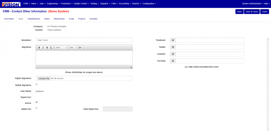 The Other tab displays the salutation, signature, digital signature, delete signature, active, opted out, facebook, twitter, linkedin, and youtube.