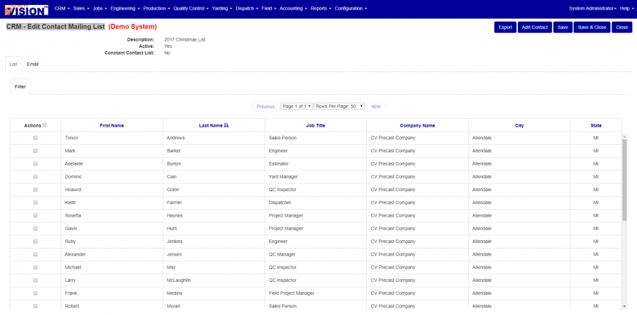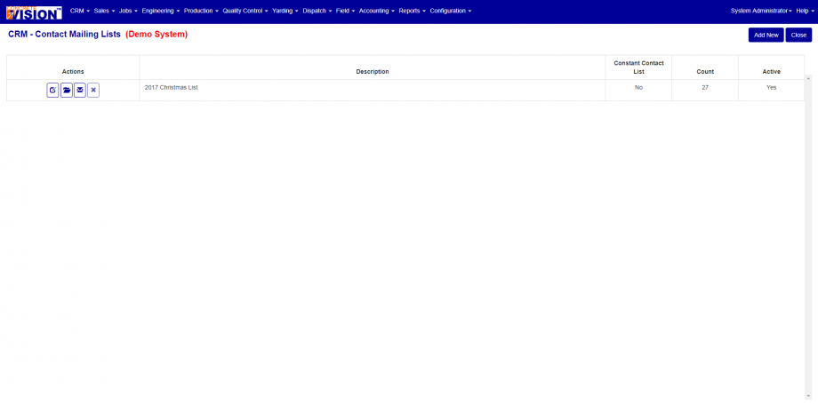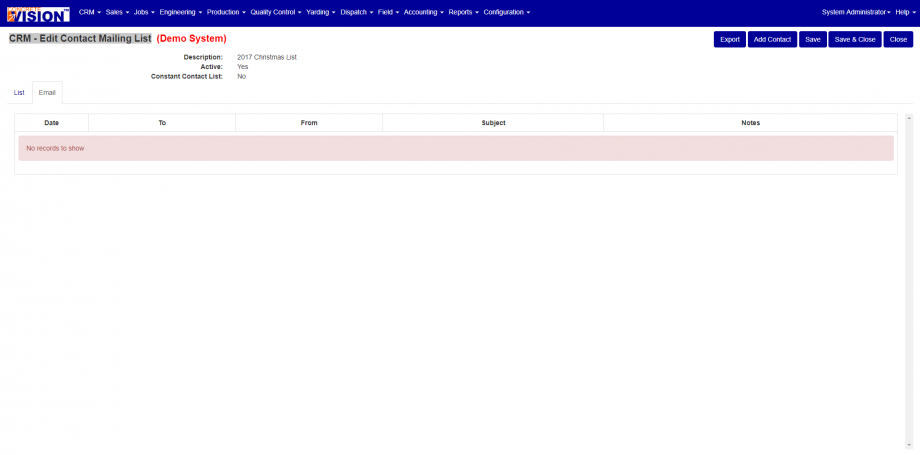 Contact Mailing Lists lets the user View, Email or Delete a Mailing List record.