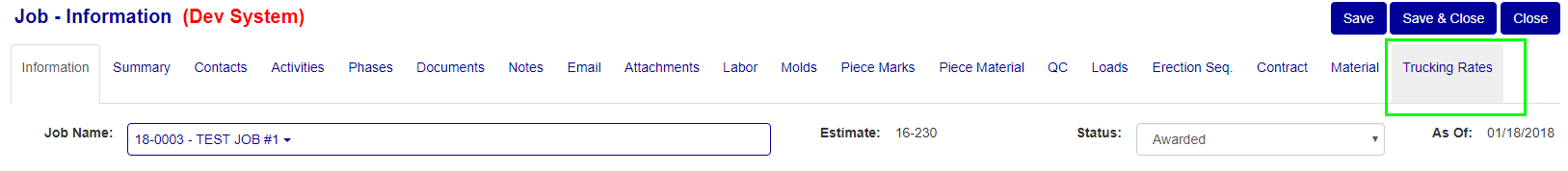 To get to the Trucking Rates screen you first have to get to the Job Information screen. To get to the Job Information screen click on any of the Job Lookup links under all the main modules on the main menu (Figure 1 for example), then click on the edit link to the job you wish to view or edit the trucking rate of (Green box in Figure 2). Once on the job info screen, click on the trucking rates tab (Green box in Figure 3). You should now be on the Trucking Rates screen (Figure 4) for a specific job.