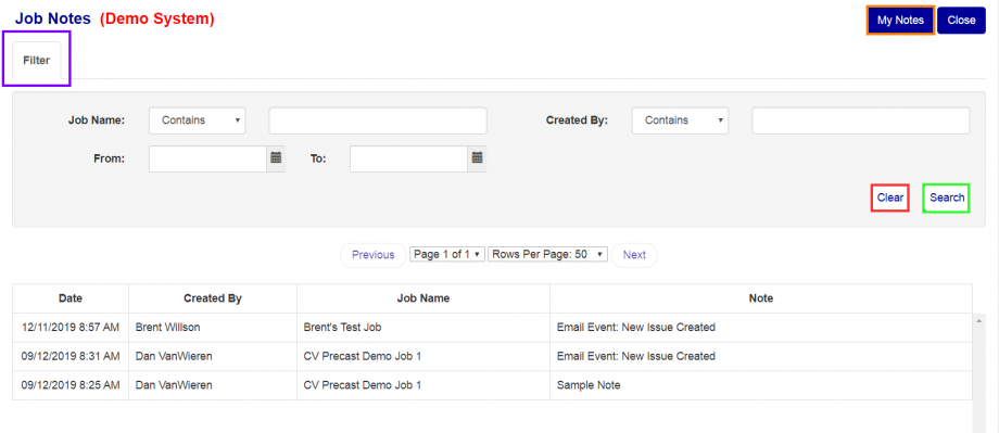 To customize the Job Notes you see, you can edit the filter parameters to see specific Job Notes by using the Filter dropdown (Purple Box Fig. 2).