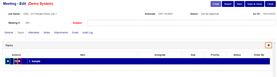 To add a new topic to the meeting, use the “+/Add” Button (Orange box Fig. 2) and fill out the detail on the edit screen it redirects you to (Fig. 3).