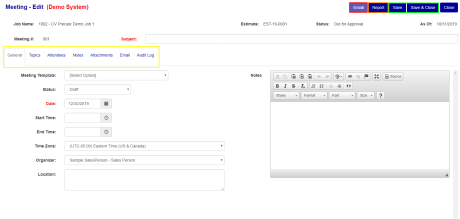 For the Meeting Project Document, you can edit the General info (Fig. 1), Topics, Attendees, Notes, Attachments, Emails, and Audit log pertaining to each meeting.