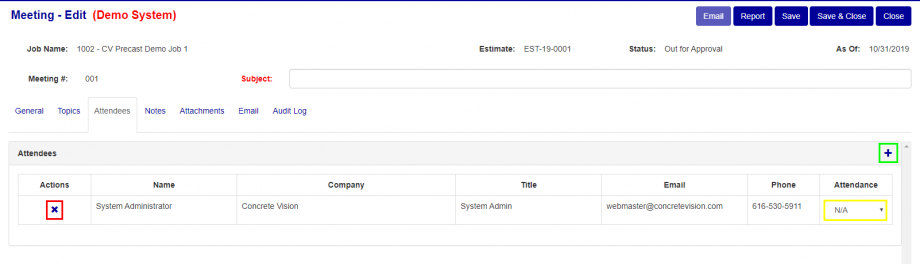 Once the meeting has started you can use the last column to mark the individuals on the list as N/A, Absent, or Present. Once all attendance has been taken, Save or Save & Close.
