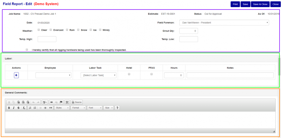 There are also a few Text Box section like General Comments (Orange box Fig. 1) where you can enter in text with minimal formatting.