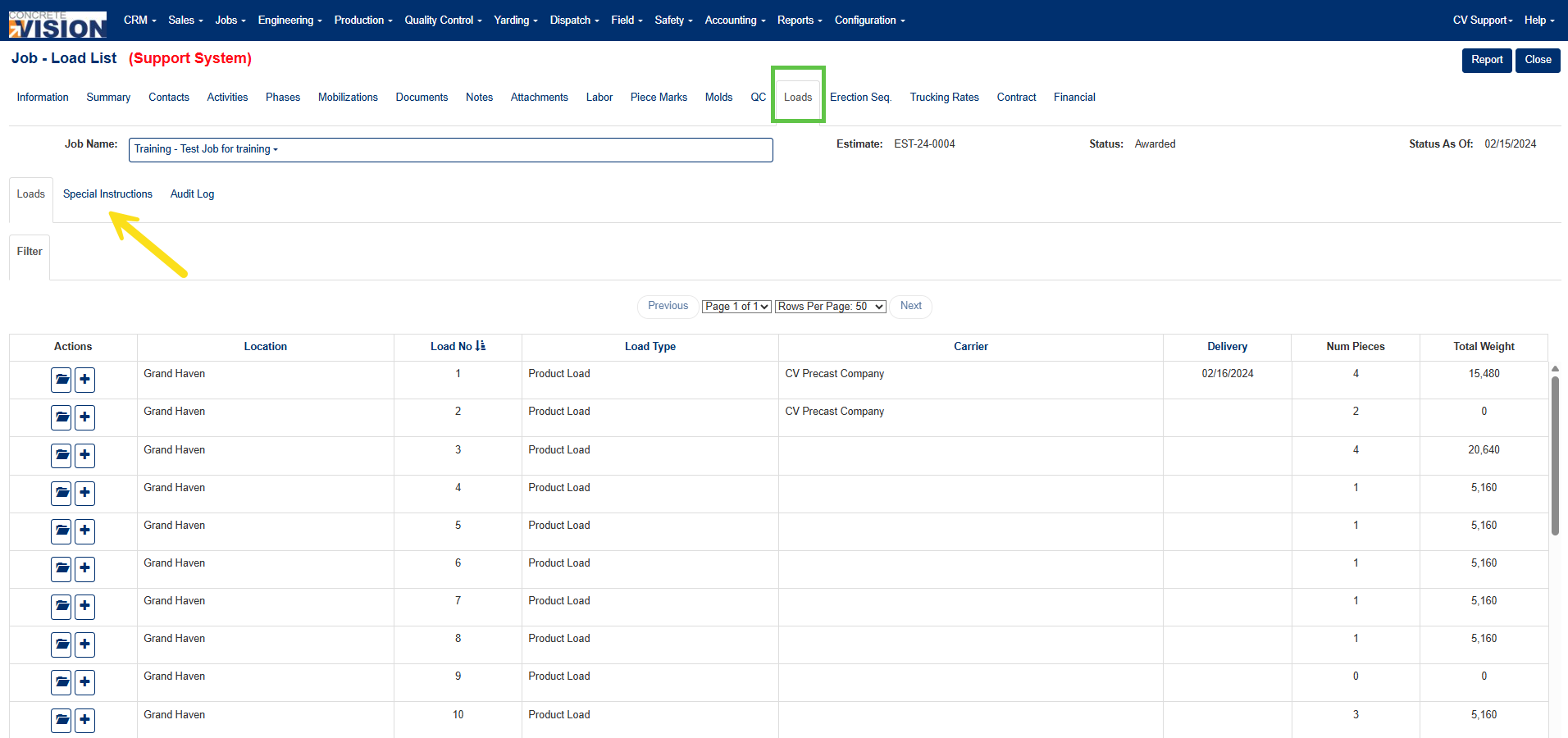 - Click the Special Instructions tab (Yellow arrow, Figure 3) within the Loads tab area.