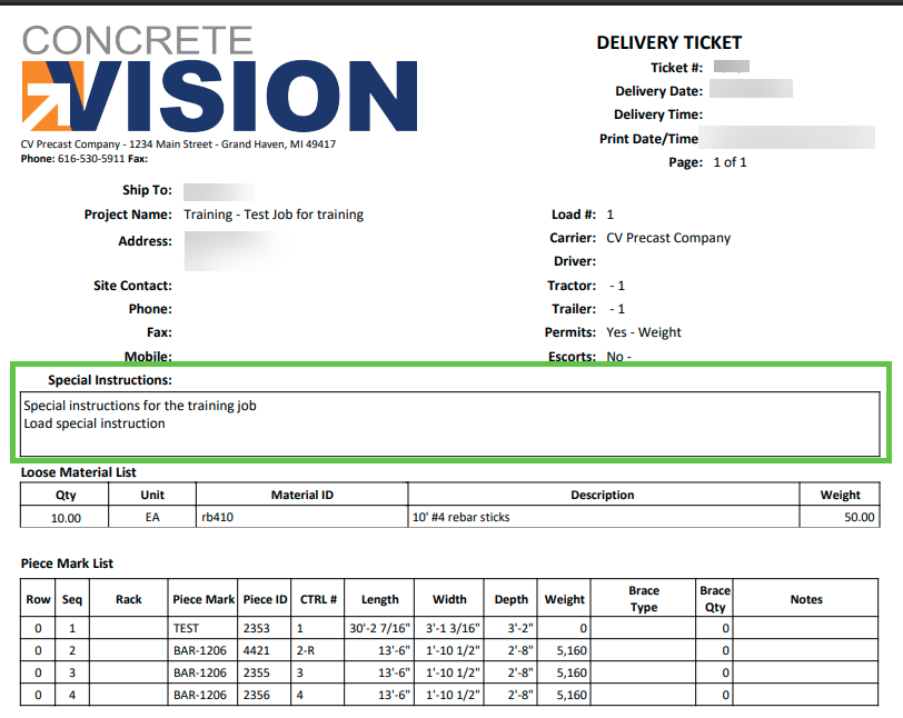 Note: Text entered in the Special Instructions text area appears in the Special Instructions section on the Delivery Ticket (Green box, Figure 5).