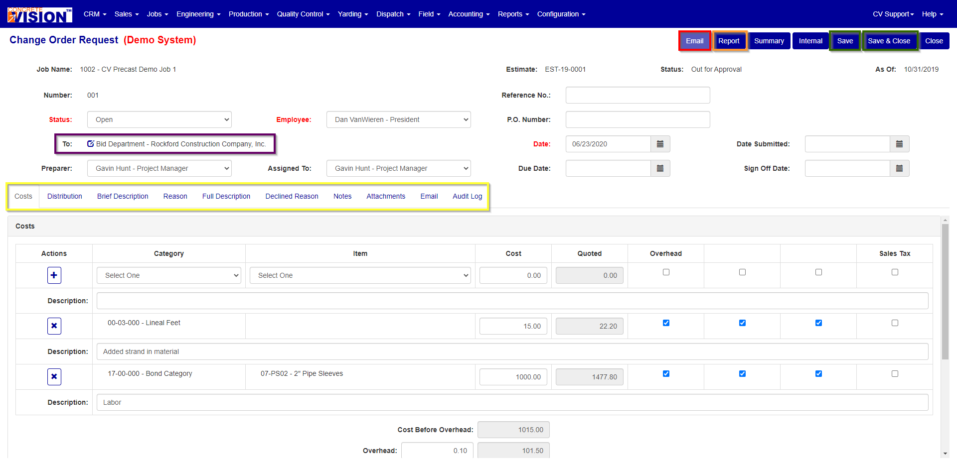 For the Change Order Request Project Document, you can edit the Costs (Figure 1), Distribution, Brief Description, Reason, Full Description, Declined Reason, Notes, Attachments, Emails, and Audit log pertaining to each issue.