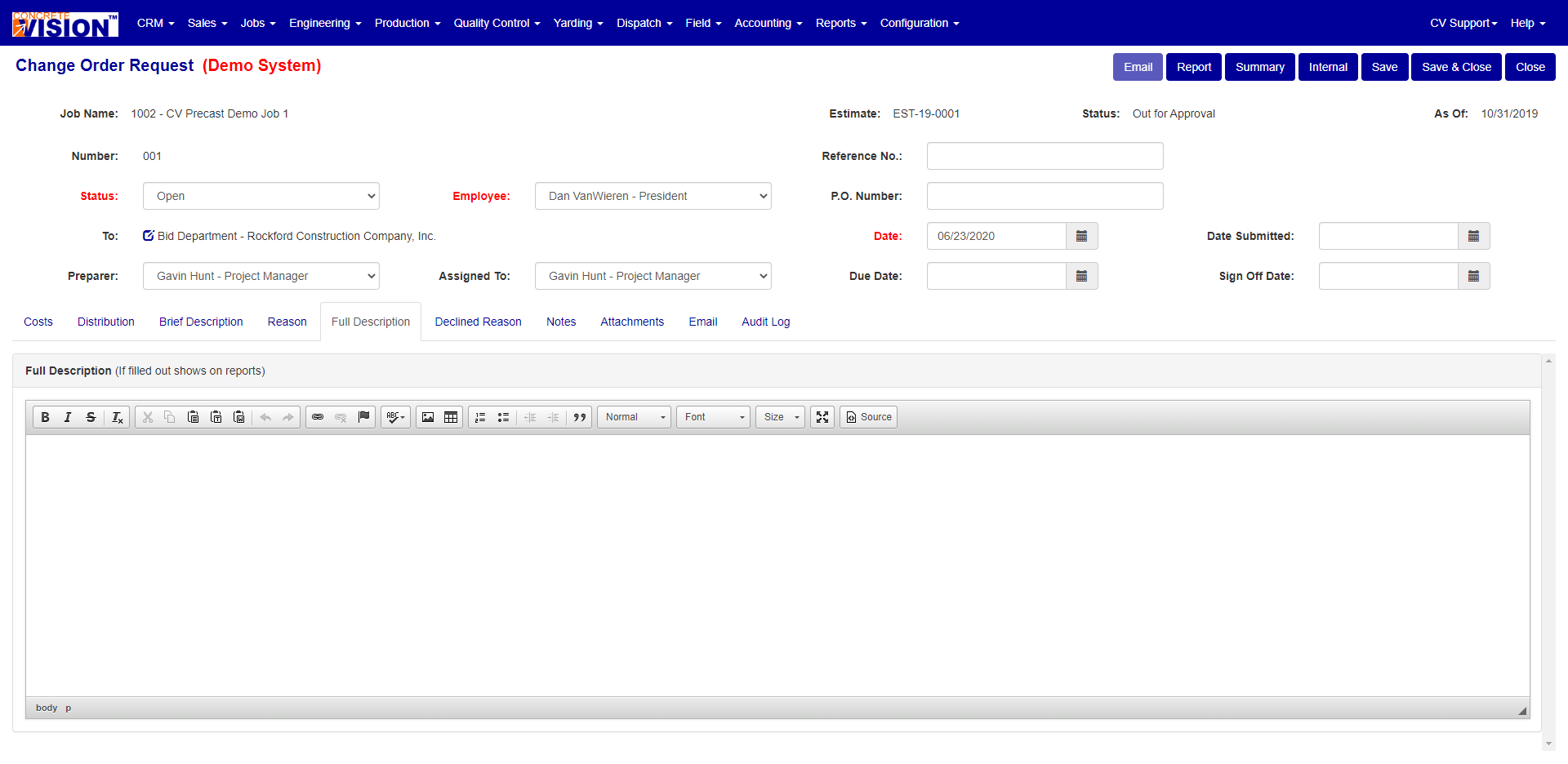 The Full Description is used to enter a full description for the Change Order Request.