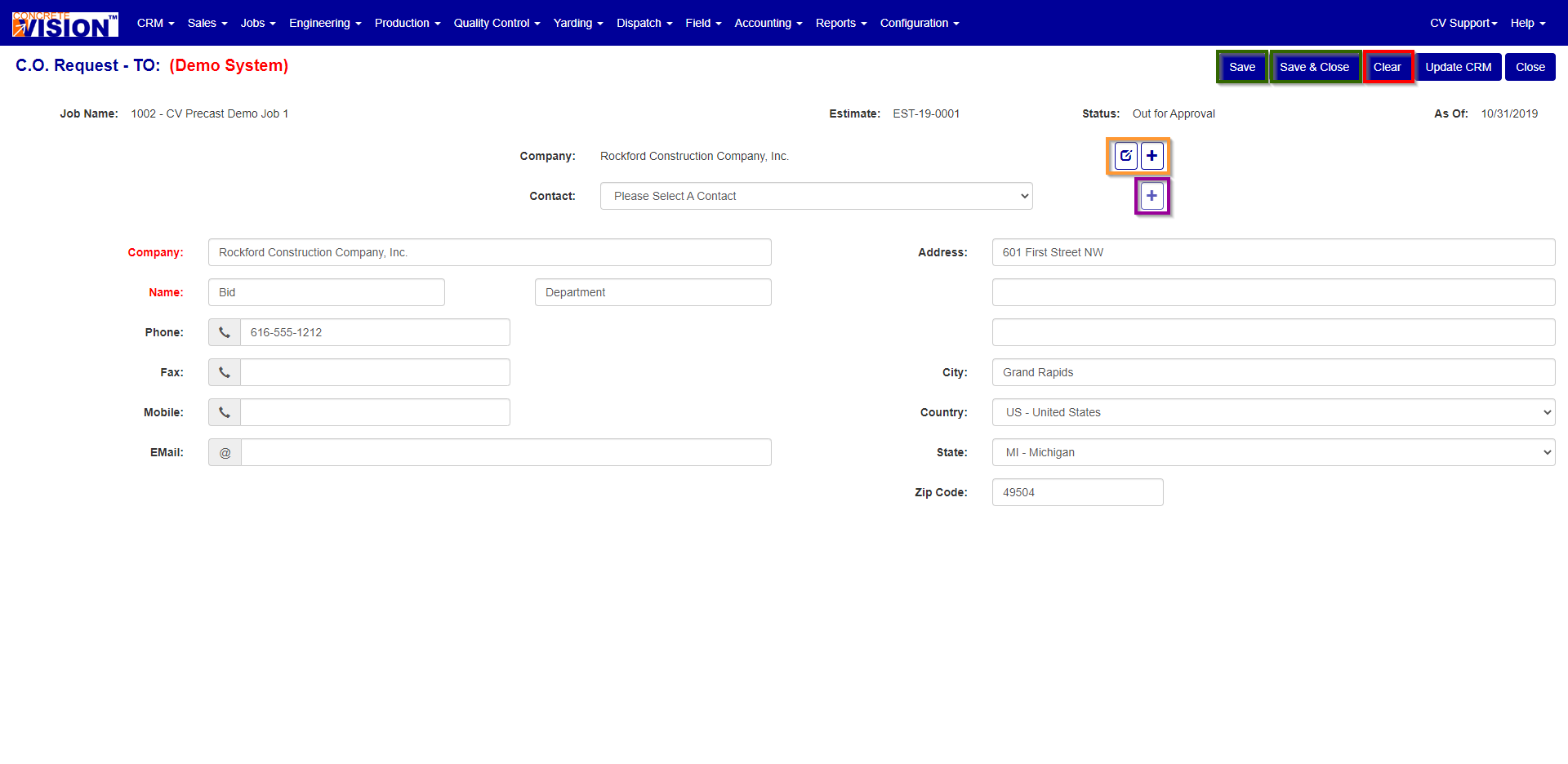 From this screen you can either edit the information for the assignee or add a new contact as the assignee. To completely clear and start from nothing for the assignee, Press the “Clear” Button (Red box Figure 3). For editing the existing assignee information, change the fields, ensuring the Company and Name are filled out before either pressing the “Save” or “Save & Close” Buttons (Green box Figure 3). You can either change assigned individuals’ company or add a new one by using the “Edit” or “+/Add” Buttons (Orange box Figure 3). To change the assignee, either select a new contact via the dropdown, or enter a new contact using the “+/Add” Button (Purple box Figure 3)