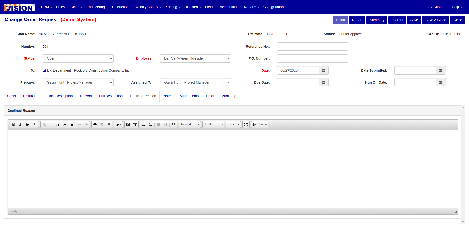 The Declined Reason is used to enter the reason the Change Order Request was declined.