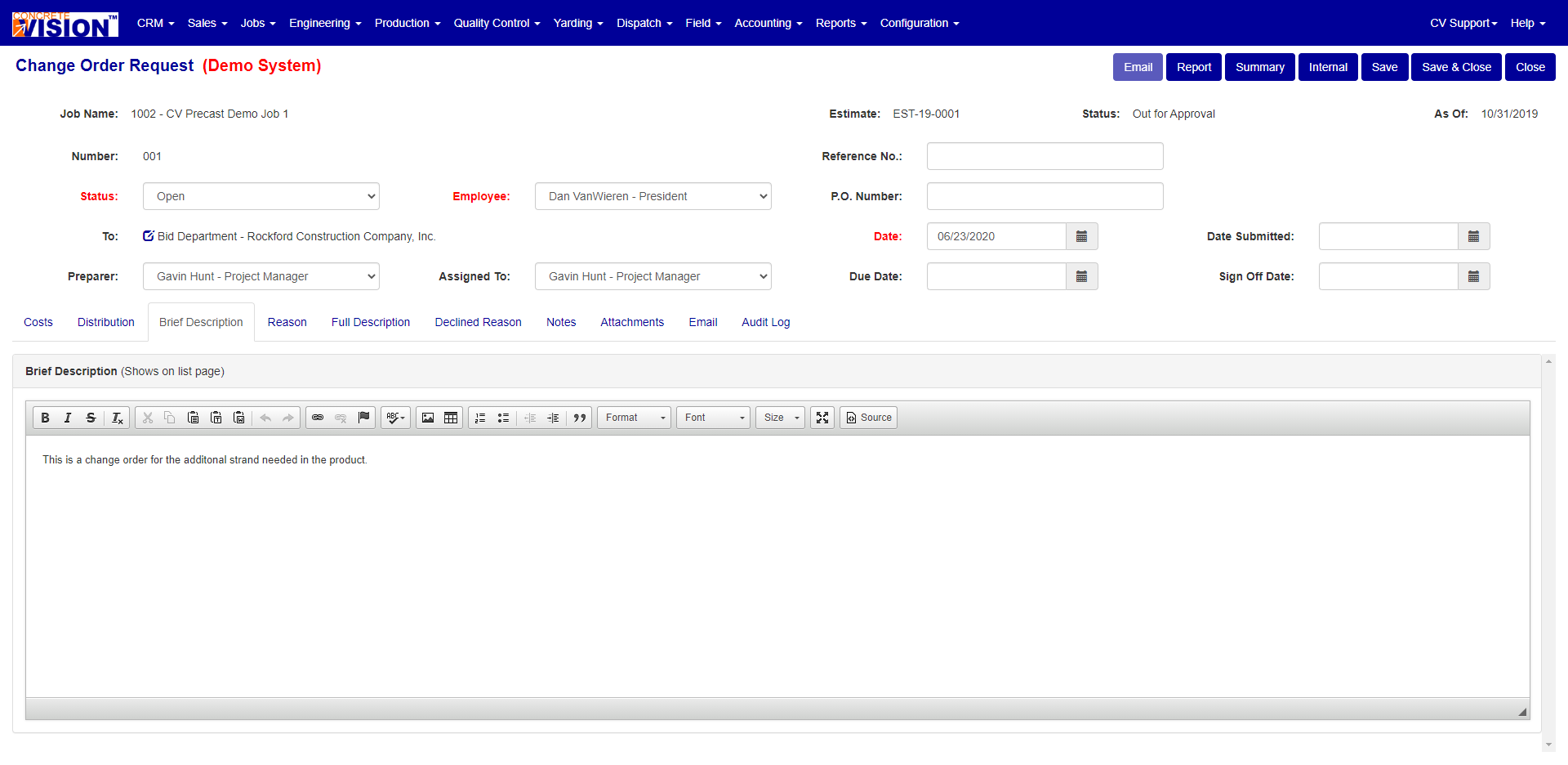 The Brief Description is used to enter a description for the Change Order Request.