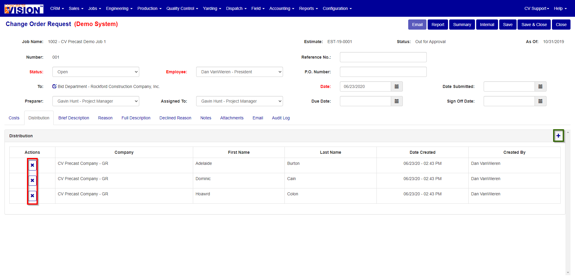 The Distribution list can be used to show everyone involved with the issue and is used for emails. To remove an individual from the list, use the corresponding “X” Button (Red box Figure 4) To add a contact or multiple contact to the list, use the “+” Button (Green box Figure 4). This will take you to the standard Contact search screen with the exception that it will check boxes along the first column, where you can check all contacts you wish to add, then press save to add them.