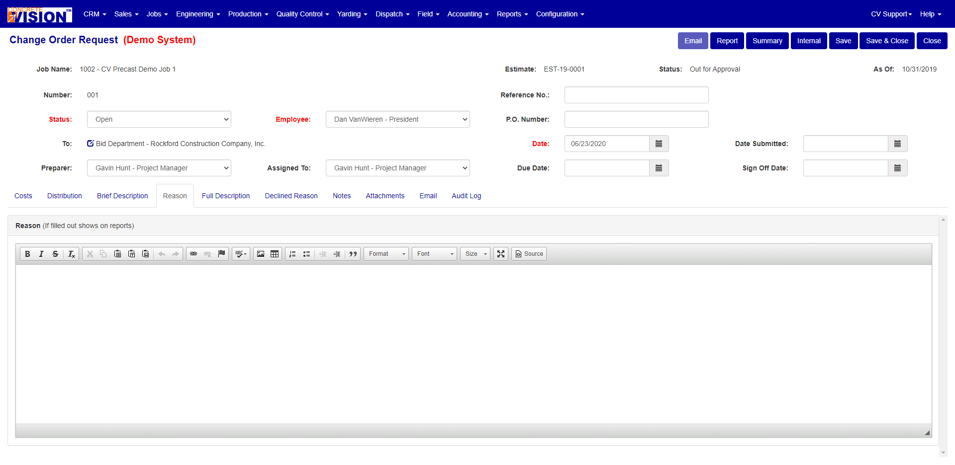 The Reason is used to enter a reason for the Change Order Request.