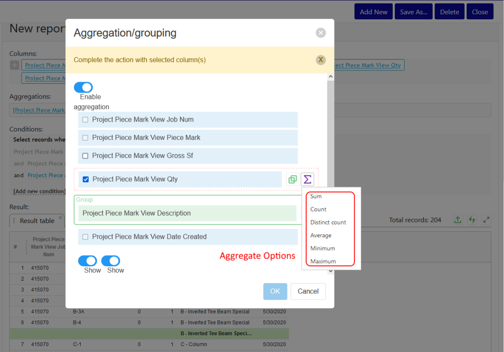 - Check the fields for which you want an aggregate