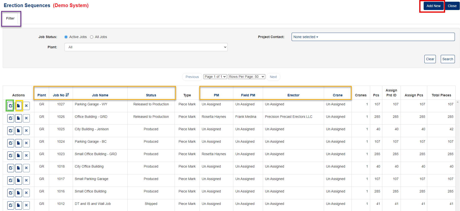 The main Erection Sequences screen displays all current sequence plans for your project, organized in a table format showing details like crane assignments, sequence numbers, and piece marks.