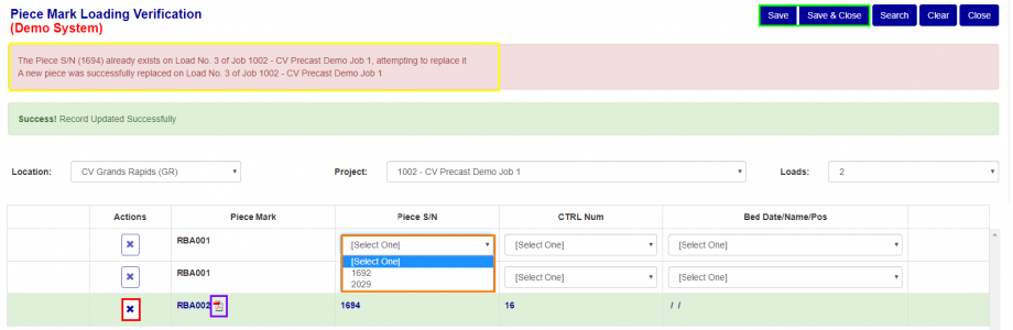 To select a specific Piece for loading, use the unique number(s) in the Piece S/N, CTRL. No., or Bed Date/Name/Pos columns to select the correct Piece. If multiple Pieces of the same Piece Mark are available (Orange box Figure 3), you can use any of the unique identifiers to select the correct one. Once you select the piece using any of the dropdowns, the corresponding information in the other columns will be automatically updated. Once all Pieces have been verified, use the “Save” or “Save & Close” Button (Green box Figure 3) to save the information.