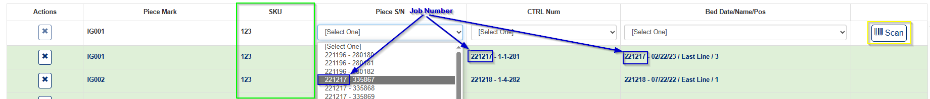 1. With the addition of SKU's for piece marks (new column shown in green rectangle, in Figure 4), you will now be able to load any valid piece serial number, that is tied to a piece with the same SKU, as the piece currently assigned to the load. If a piece mark contains a SKU number, the job number is prepended to the data under the "Piece S/N", "CTRL Num", and "Bed Date/Name/Pos" columns (shown in Figure 4).