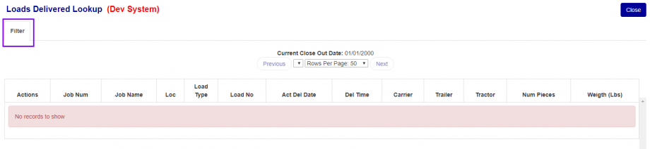 When you first open the Loads Delivered Lookup screen, no data will be displayed (Figure 2). You must apply at least a Location filter to view results.