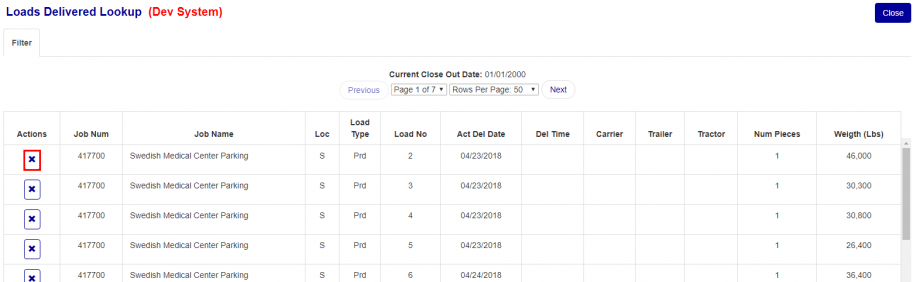 - Actions - Contains the X button to mark loads as undelivered