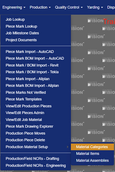 Note: A category cannot be deleted if it's currently assigned to a material item, a material assembly or is a top-level category with subcategories assigned to it.
