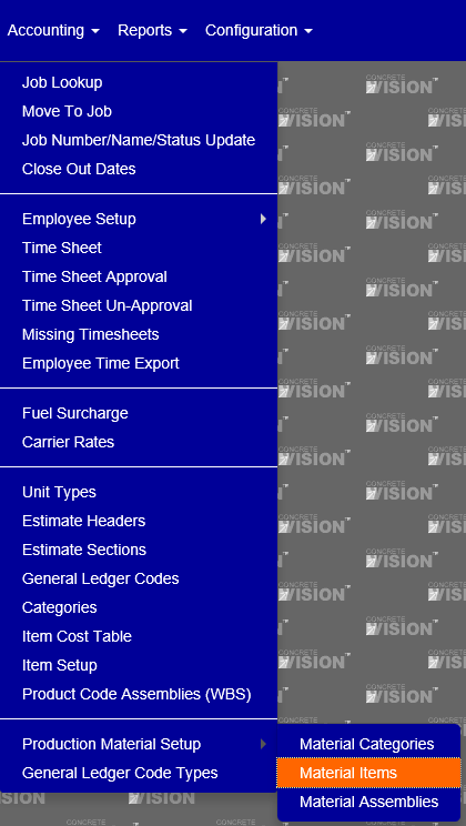 You can access the Materials Items setup screen from Accounting > Production Material Setup > Material Items as shown in Figure 1 below: