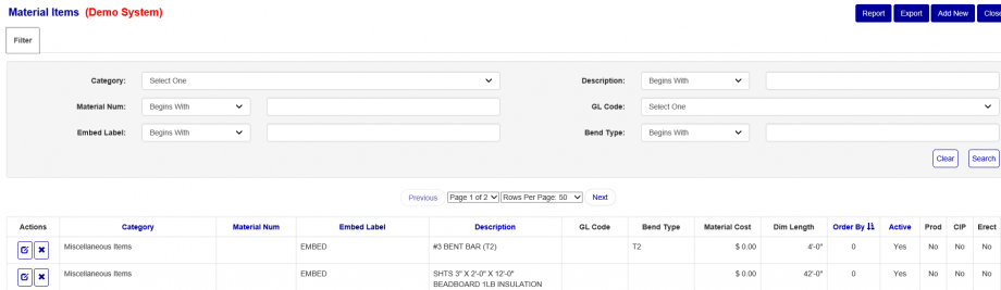 This will bring you to the Material Items list screen shown in Figure 2 below. From this screen, you can Edit, Add, or Delete an existing material item (provided the material item is not being used as part of an assembly and it's not a default "Internal" material item).  You can also print out the list report or export to Excel.  The filter section allows you to filter down the list by various criteria.