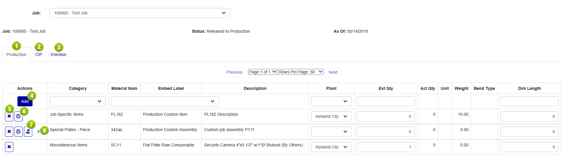 Before adding and/or editing any material, make sure you select the correct job and are under the correct tab for the material being added/edited ("Production", "CIP" or "Erection" - tabs 1-3 in Figure 2).