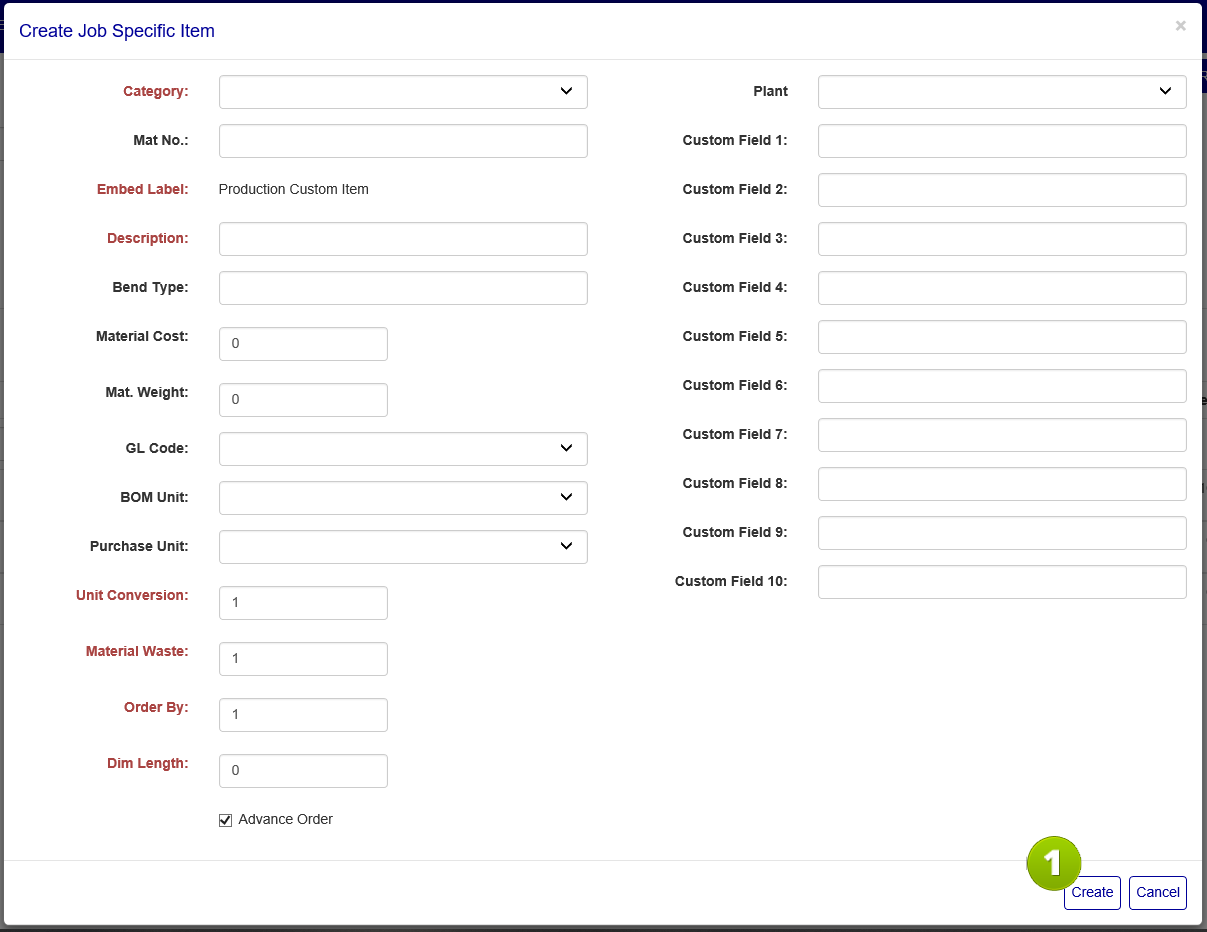 - Once finished, clicking on "Create" (button 1 in Figure 4) will close out and save the entered material to the job. Any custom production material added will also be available to be selected from the piece marks material screen.