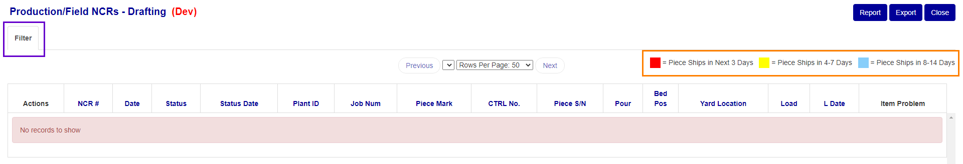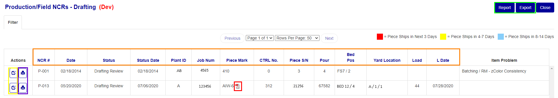 If an NCR fits into one of the status’ described above the table, the row will be highlighted the color denoted in the key. Blue for Pieces shipping in 8-14 days, Yellow for 4-7 days, and Red for within the next 3 days.
