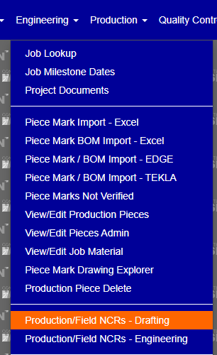 You access Production/Field NCRs - Drafting from the Engineering > Production/Field NCRs – Drafting menu, shown below.