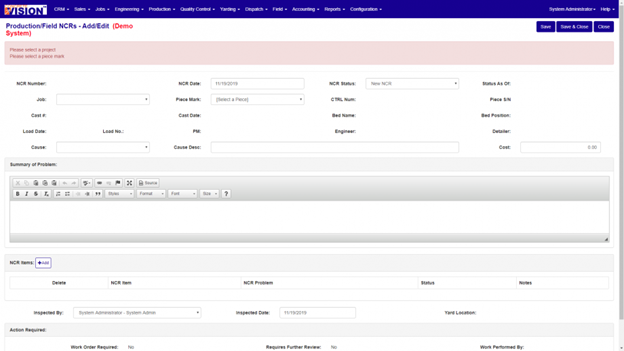 **To be able to save the Production NCR, you must first pick a job and a piece mark. If you do not select a job and a piece mark you will receive an error (see Figure 6).