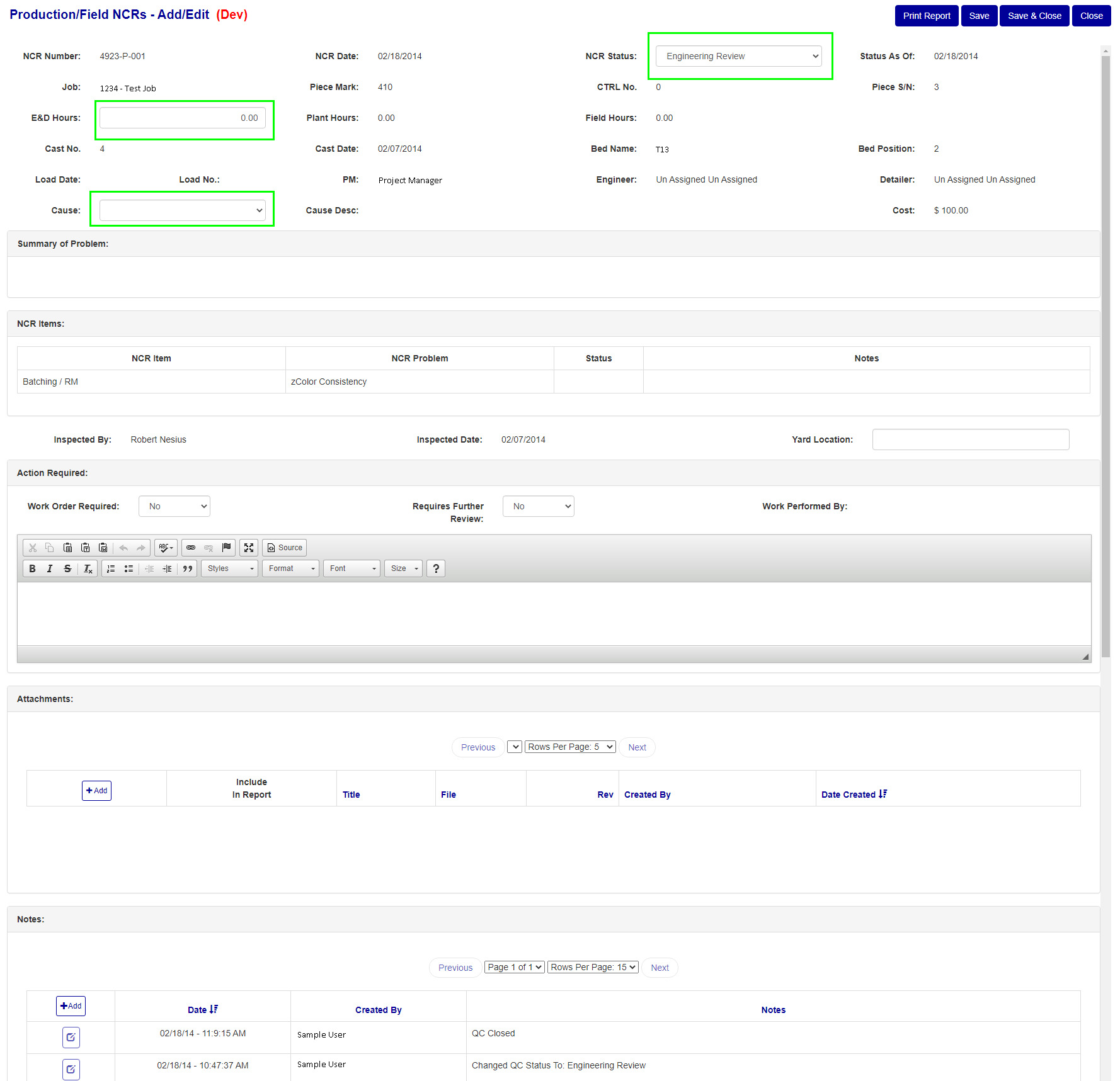Once the Production NCR is open you will be able to edit the following fields.